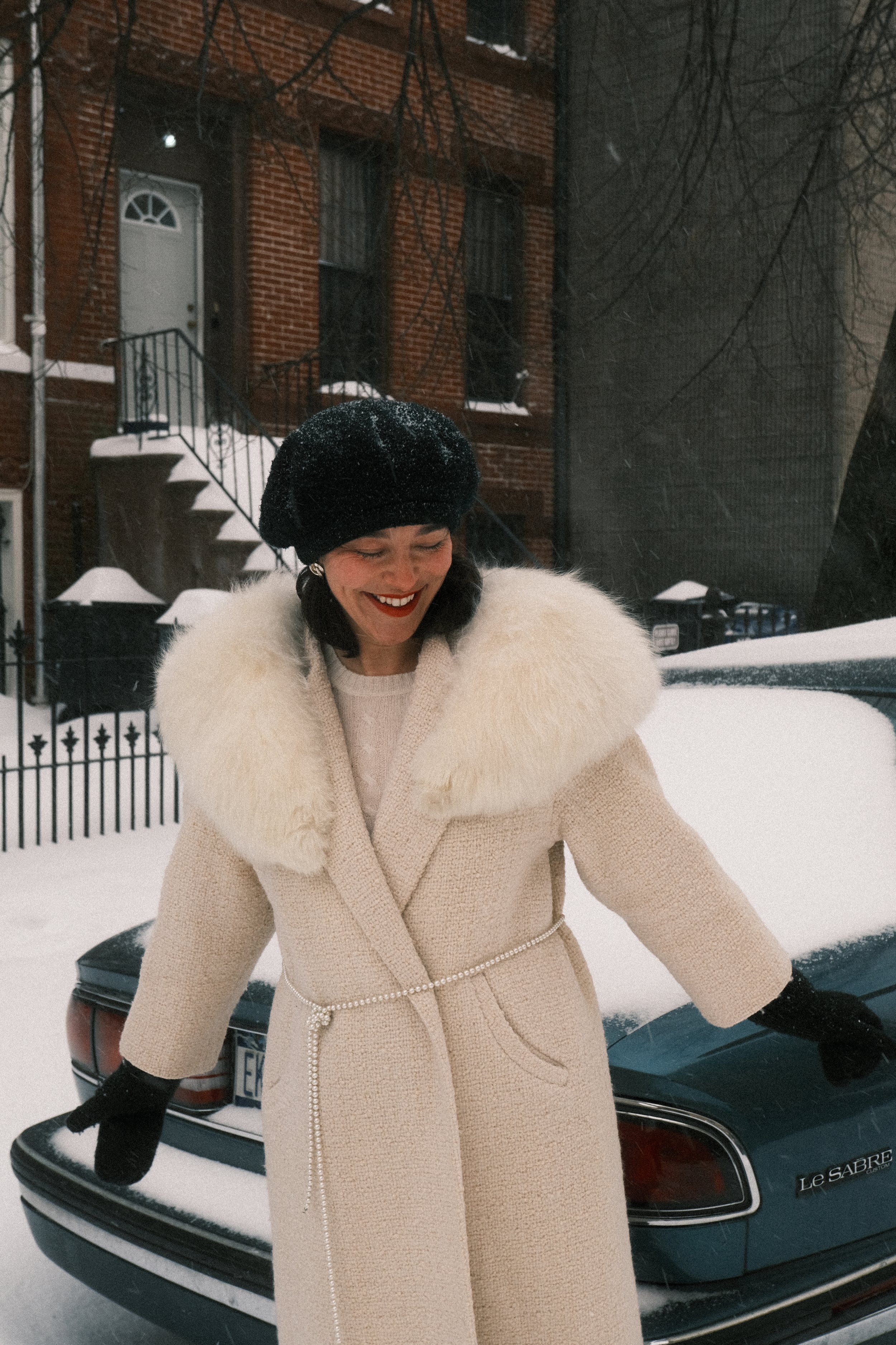 Cream textured bouclé coat by La Selle featuring a luxurious fur shawl collar, double slit pockets, and full finished satin lining. Original tag dates this piece to 1960s by the L.S. Ayres co of Indiana - a prominent department store and Tea House located in Indianapolis from 1906-2006. Note this garment has no closure. Condition is excellent.