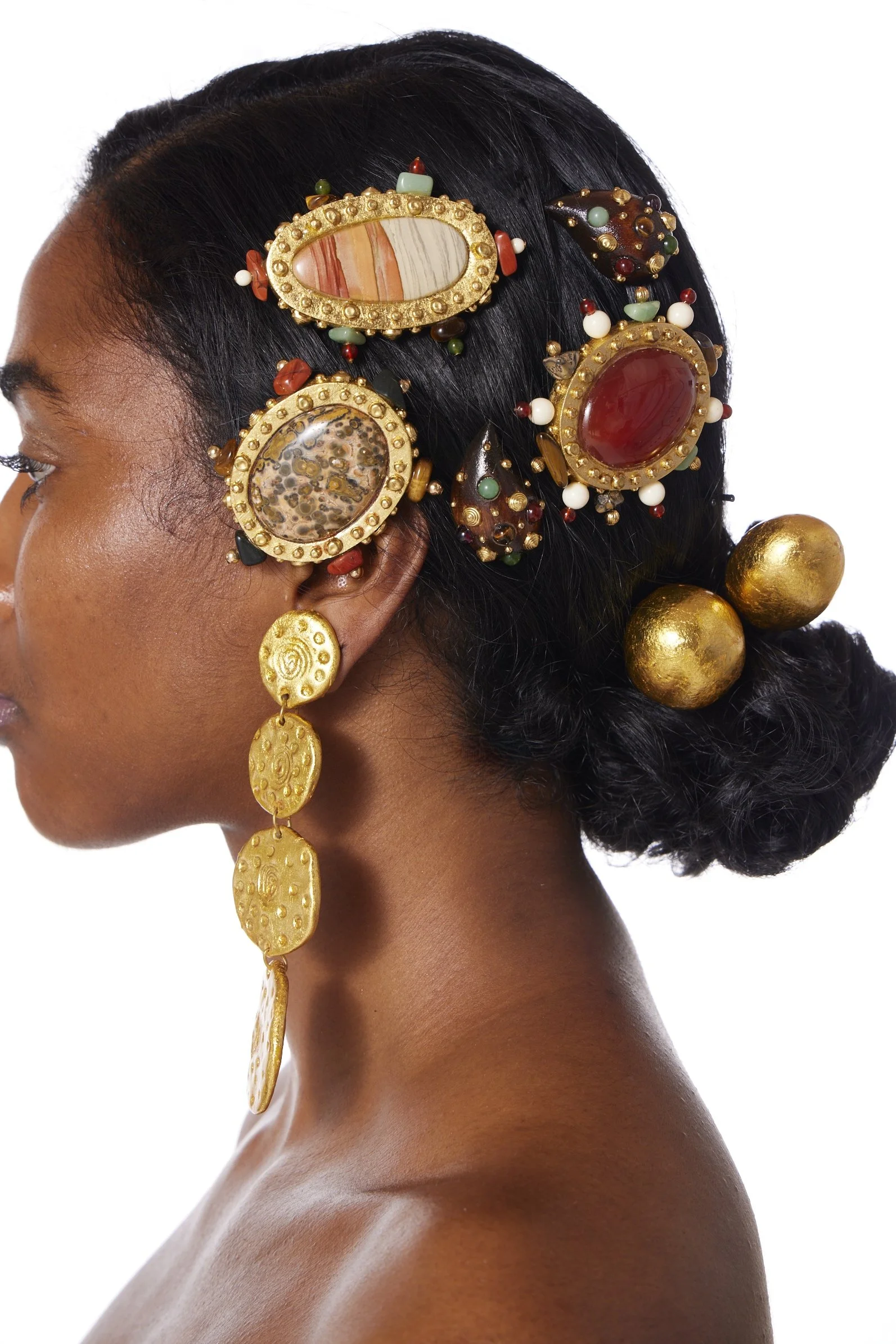 One‑of‑a‑kind freeform‑cut desert jasper cabochon brooch, with rich striations of beige, coral, and terracotta. Set in a hand‑carved wood bezel finished in luminous gold leaf, and accented with a halo of nailheads and polished semi‑precious beads in complementary tones. Signed "CYNTHIA RYBAKOFF NEW YORK 1992"