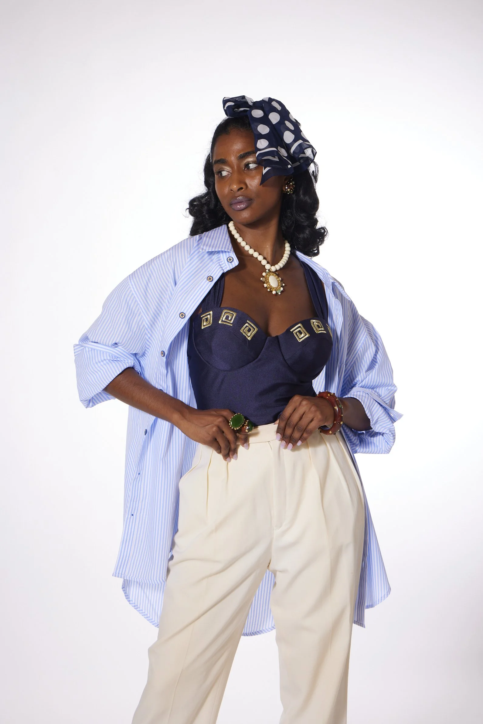 Classic navy scarf adorned with all-over white polka dots. Crafted for versatility, it can be styled around the neck, as a chic headscarf, or draped as a lightweight shawl.
