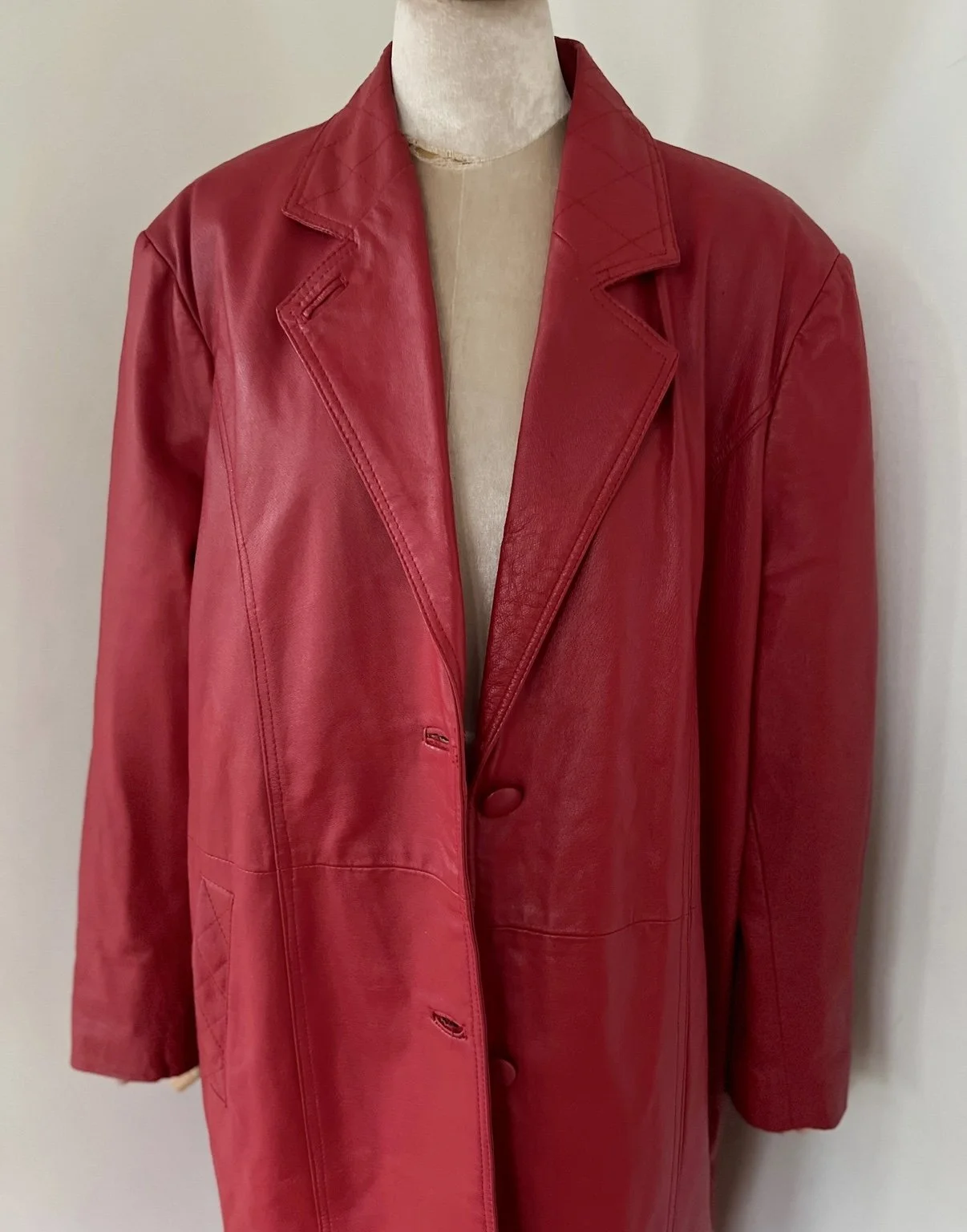 80s cherry red leather trench coat featuring a classic notch lapel accentuated with a grid top stitch detailing, fabric covered button closure, and a straight cut tailored fit. Super supple leather with a smooth matte finishing.