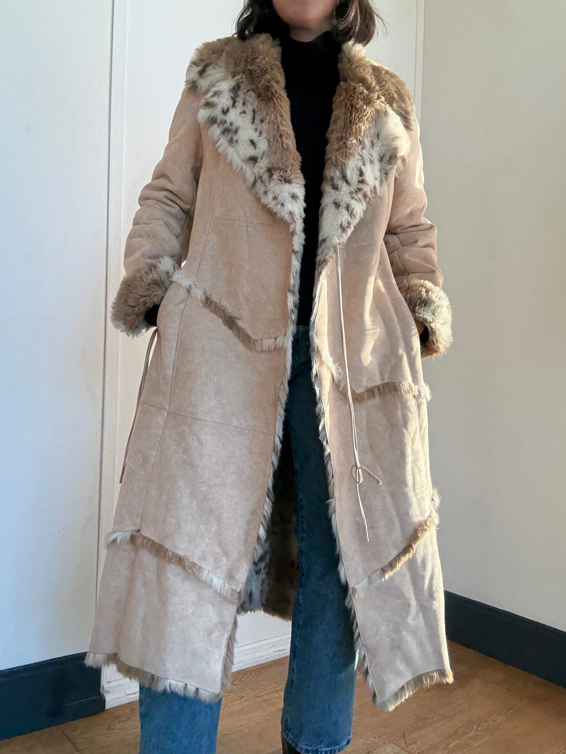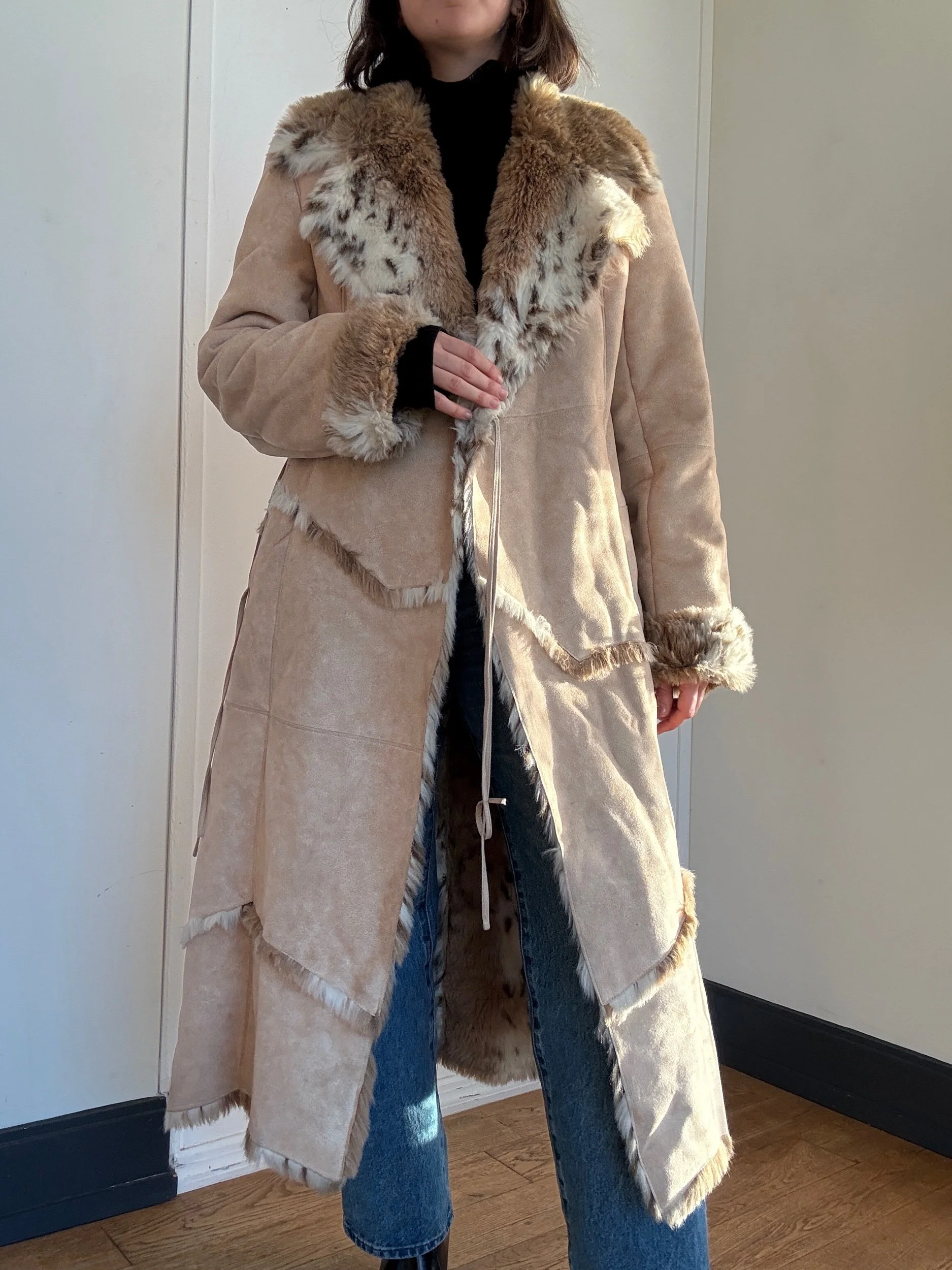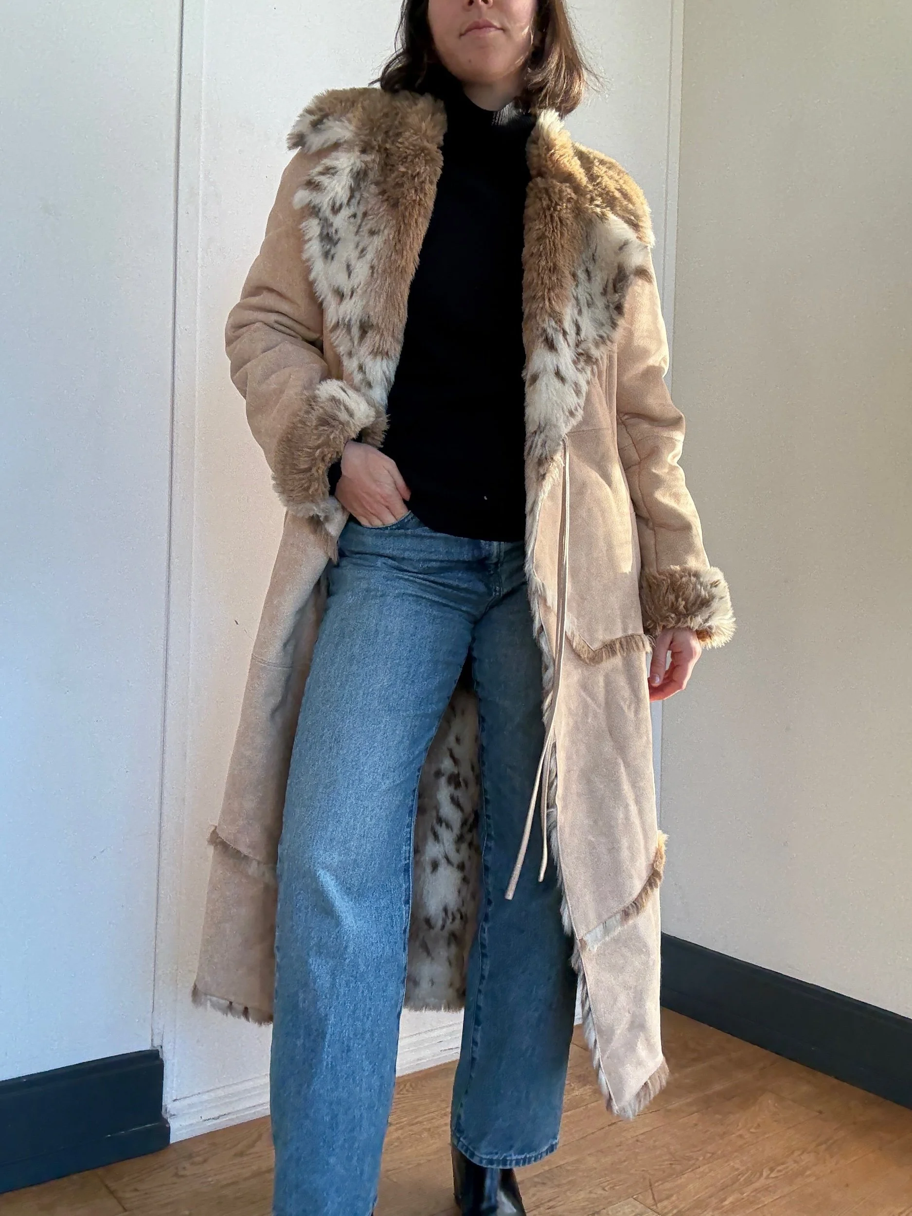 Scandinavian faux suede and faux fur lined maxi coat featuring a self tie closure, oversized notched lapel, double pockets, and fur detailing around the body of the coat. Such a stand out bohemian piece to keep you warm and strikingly fabulous.