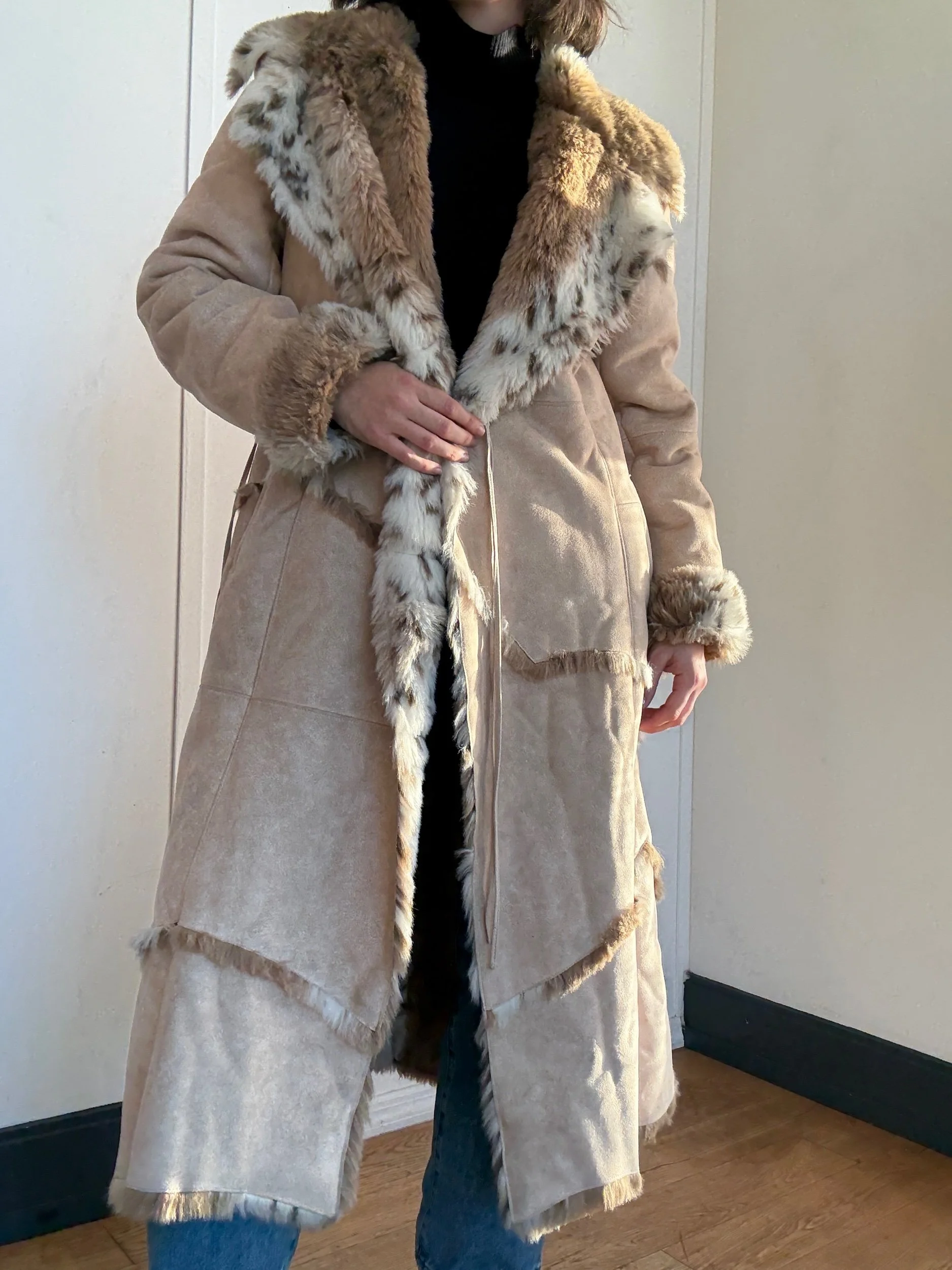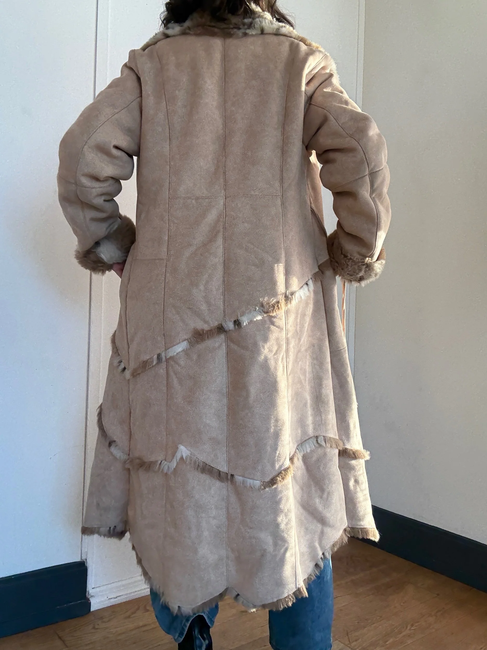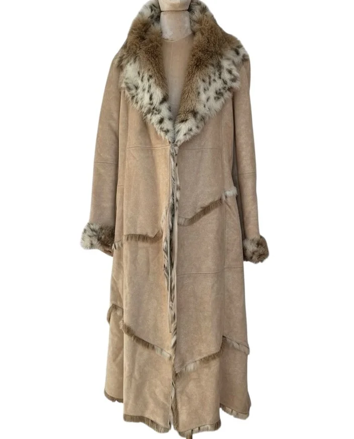 Scandinavian faux suede and faux fur lined maxi coat featuring a self tie closure, oversized notched lapel, double pockets, and fur detailing around the body of the coat. Such a stand out bohemian piece to keep you warm and strikingly fabulous.