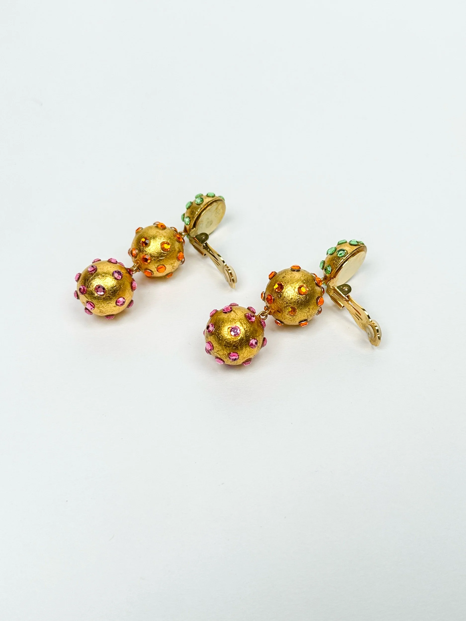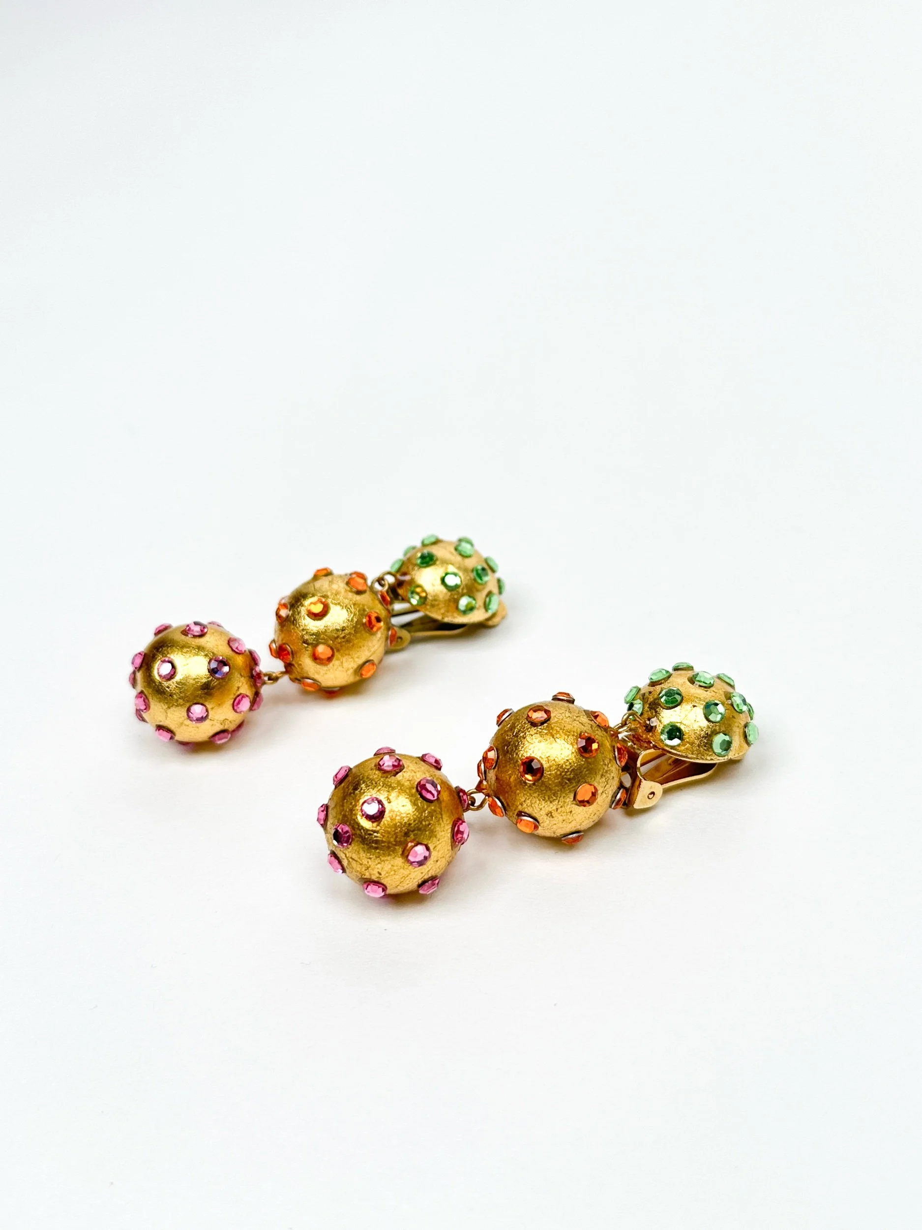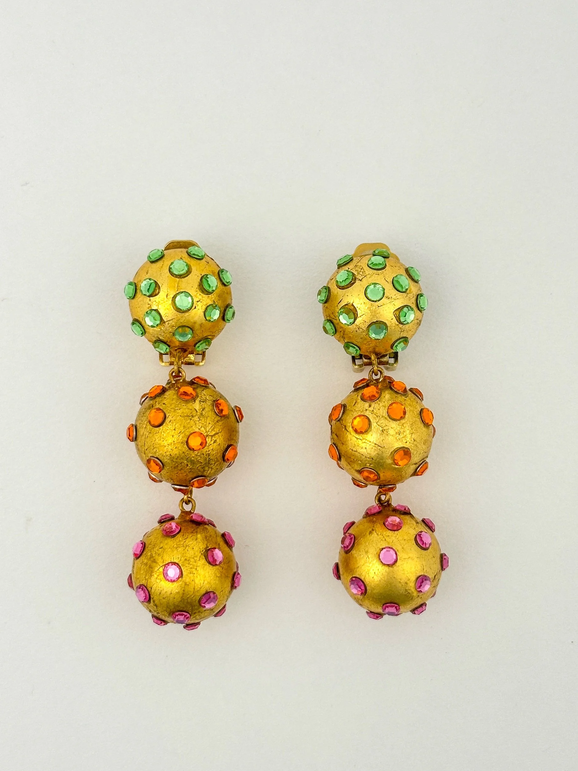 Hand‑gilded baubles in gleaming gold leaf, sprinkled with fuchsia, hyacinth, and peridot Swarovski crystals in a three‑ball clip‑drop style.