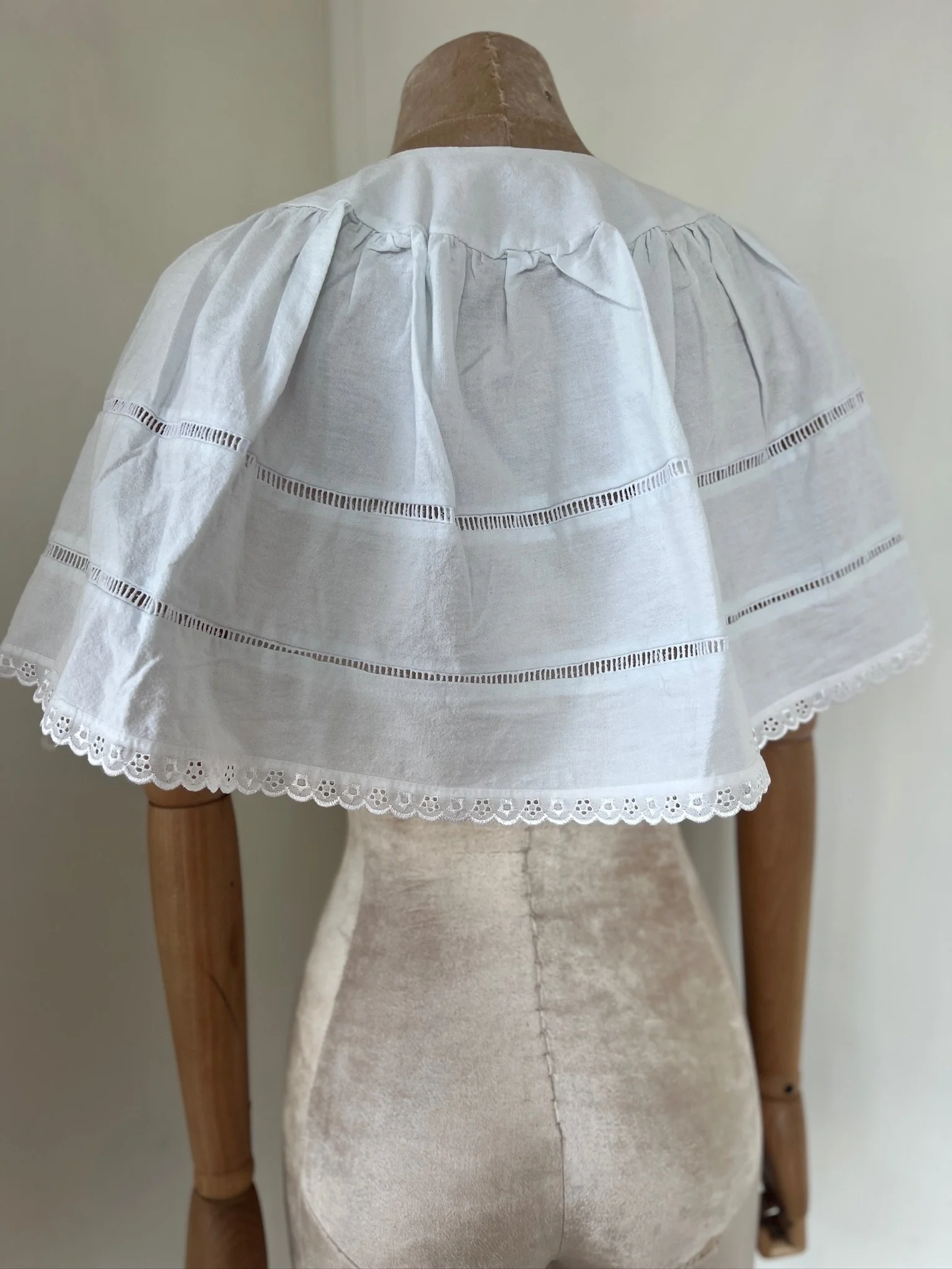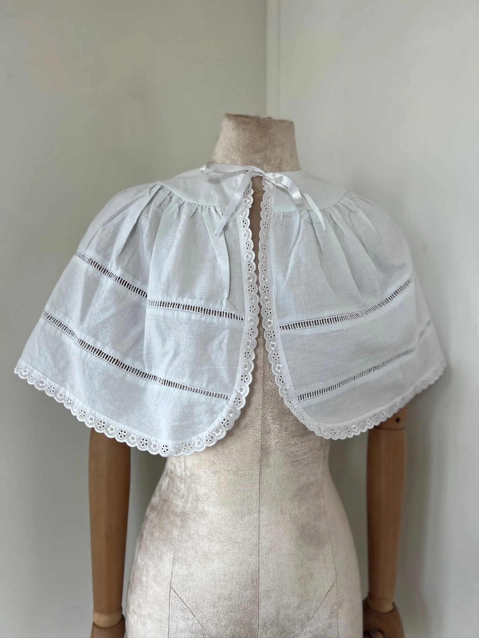 Handmade lightweight cotton cropped cape with rounded hem, delicate cutout detailing, and an eyelet lace trim. Cape comes to a closure at the center front neckline with two satin ribbons in ivory white.
