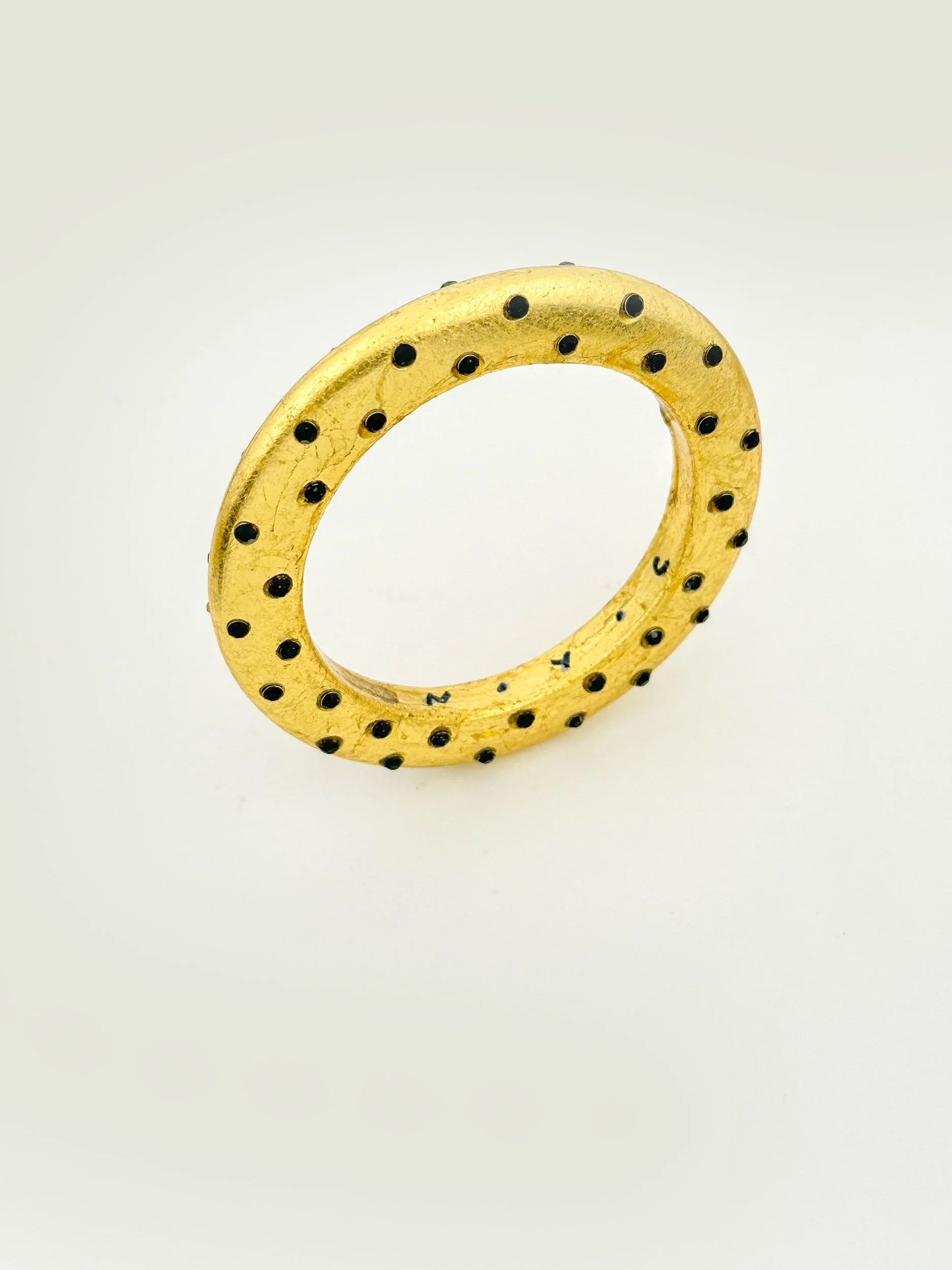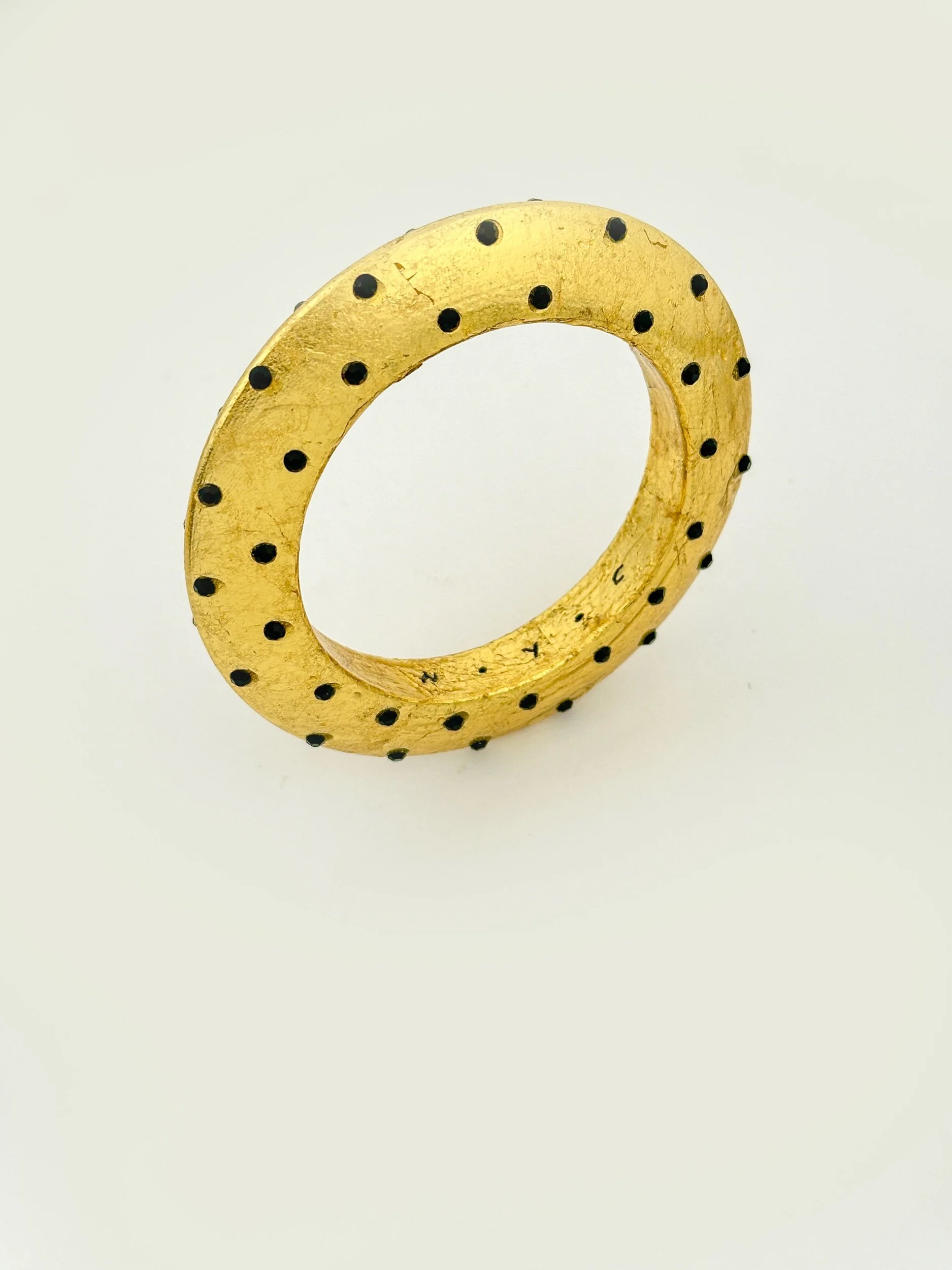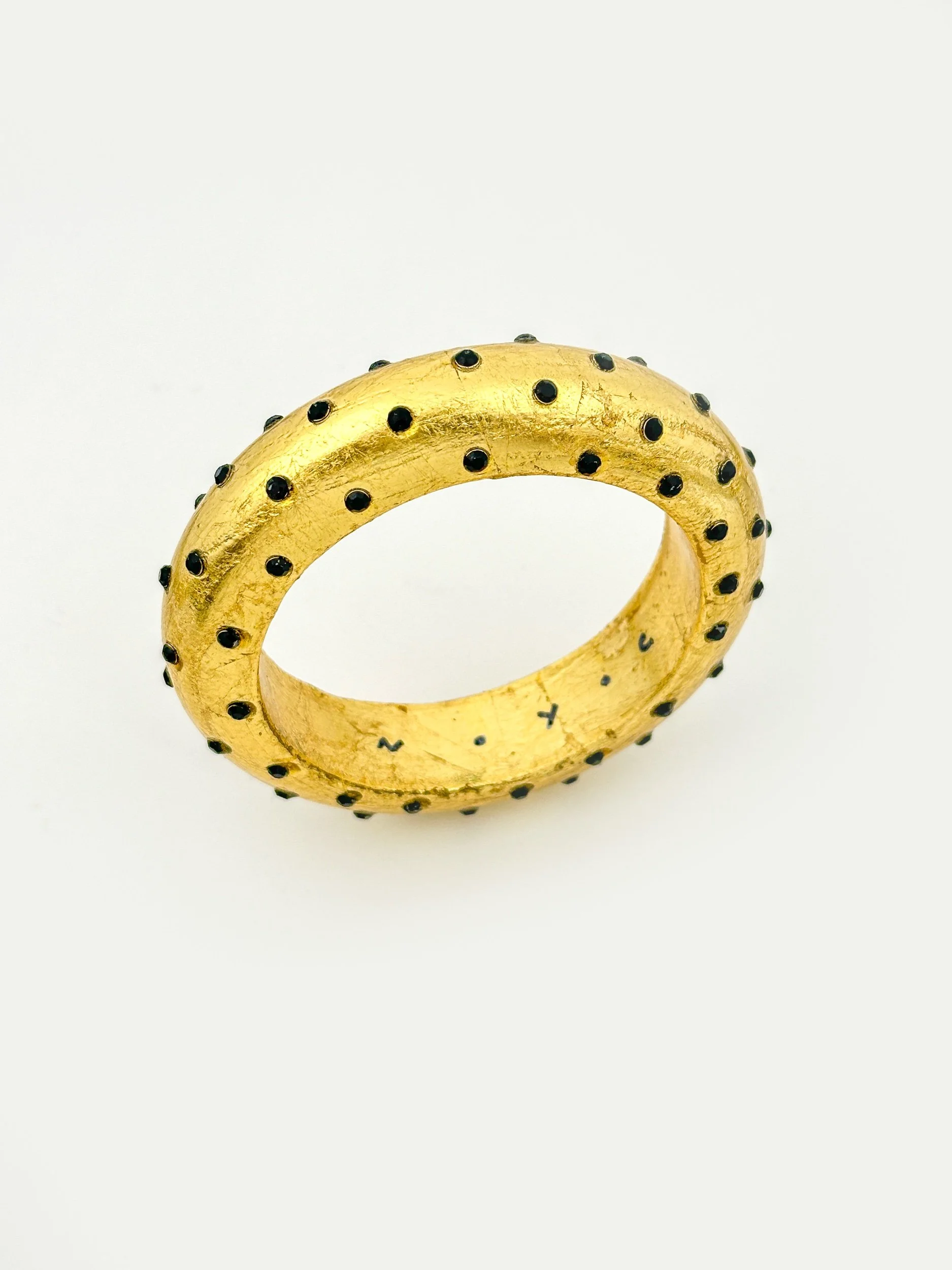 Hand-gilded domed bangle bracelet in gleaming gold leaf sprinkled with Swarovski jet crystals. Sold as set of 3. Signed "CYN NYC".