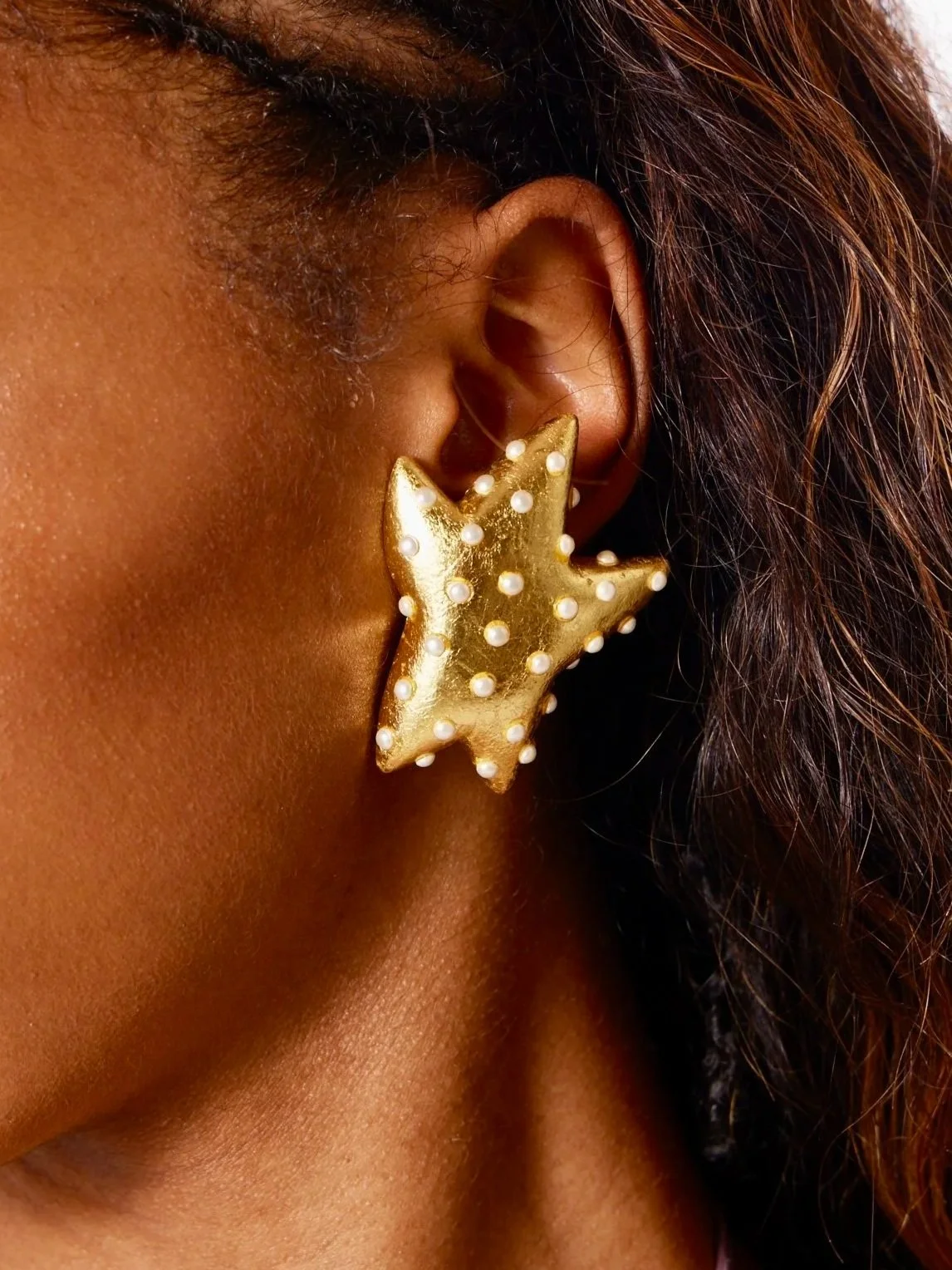 Hand-carved wood starfish ear clips golden in gleaming golf leaf sprinkled with Swarovski pearl cobochons